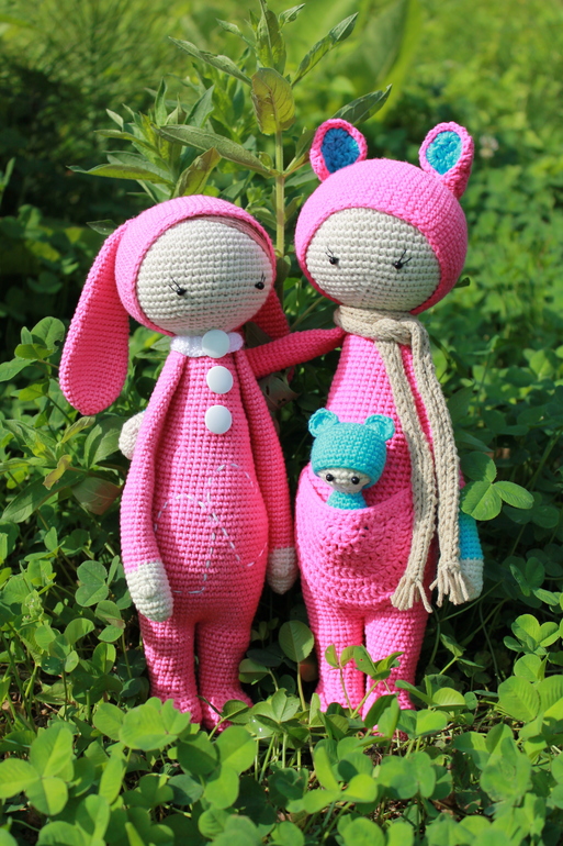 Замечательные иргушечки))) Куколка такая трогательная, миньёны чУмовые, особенно фиолетовый :)) а куклёны зайка и кенгуру — это особенные малышки, последнее время всё чаще заглядываюсь на подобных амигурумиков :))п.с. а вы миньёнчика по описанию вязали или из головы? влюбилась в вашего желтенького, очень захотелось связать и себе :)))
