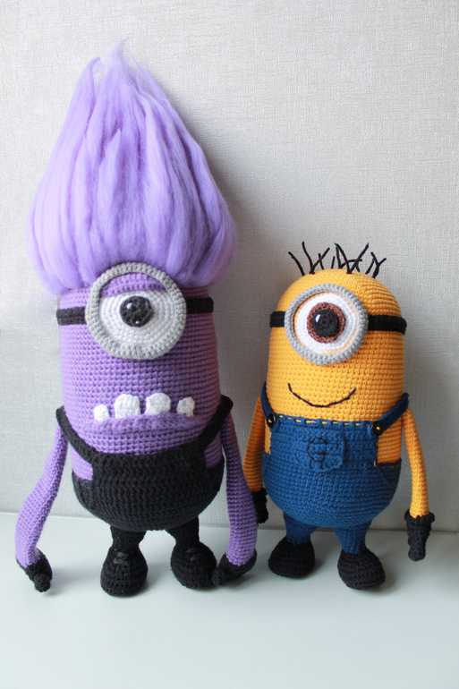 Спасибо. Миньон подсмотрен на сайте амигуруми, кое-что связала как умею, как мне показалось так лучше, что-то полностью по схеме. Кукла из головы, я чуть выше написала про неё. В интернете есть в свободном доступе кое-какие схемы, можно подсмотреть и связать что-то свое. Миньона легко вязать, гораздо сложнее пришить все потом, вернее не сложнее, а нуднее. Я все руки изколола пока пришила.