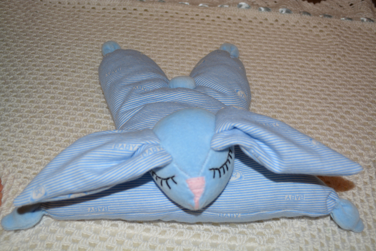 Сшила для сынули заю из любимой когда то пеленки. Набит холофайбером и вишневыми косточками. Поселился в кроватке сына