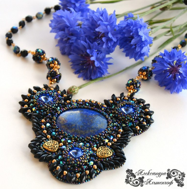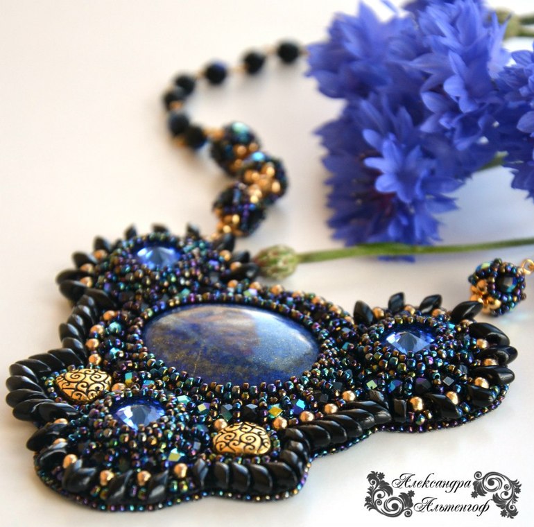 в центре это лазурит, так же тспользованы кристаллы Swarovski, бусинкиTierraCast, чешские граненые бусинки и японский бисер