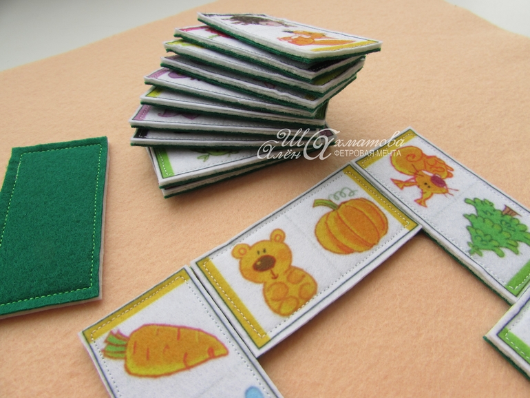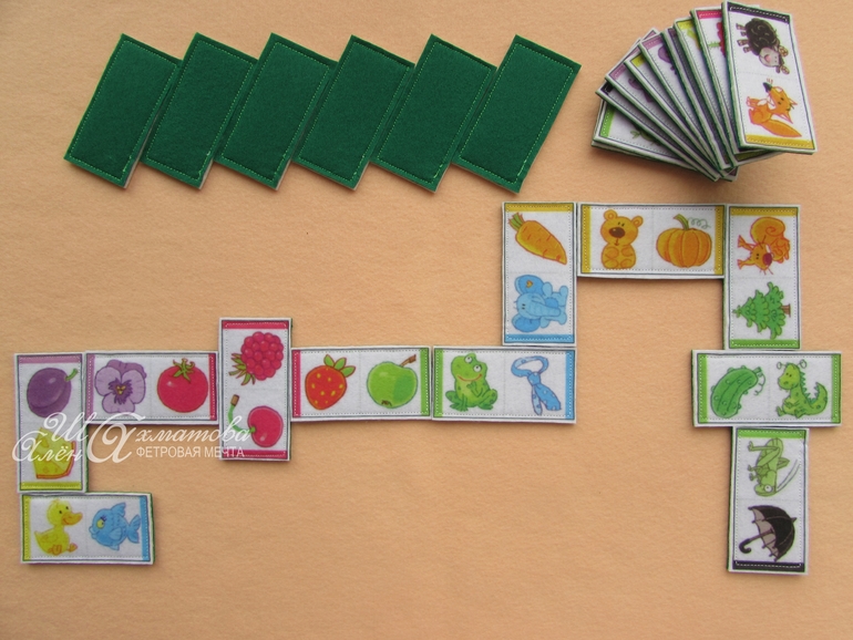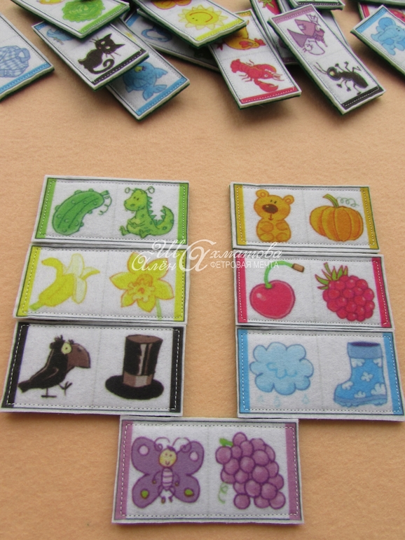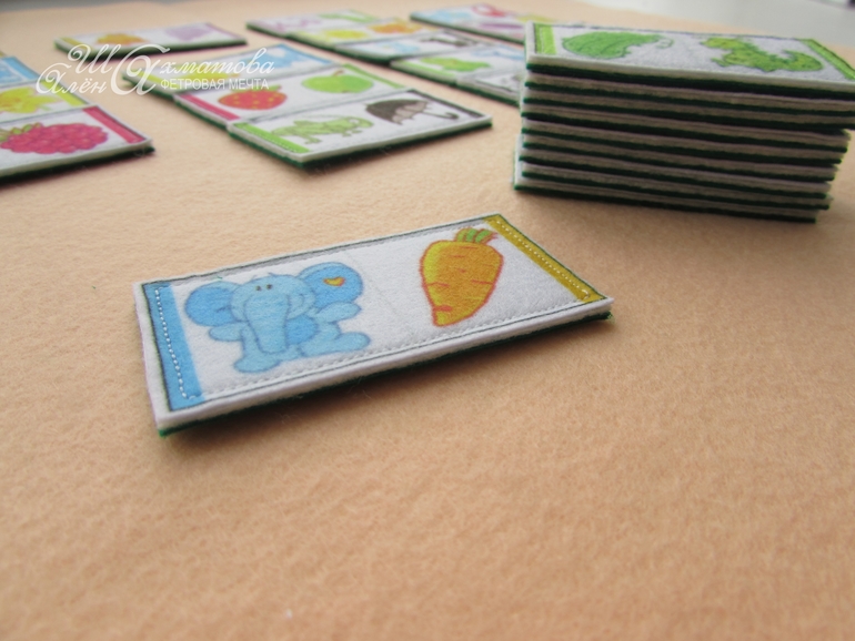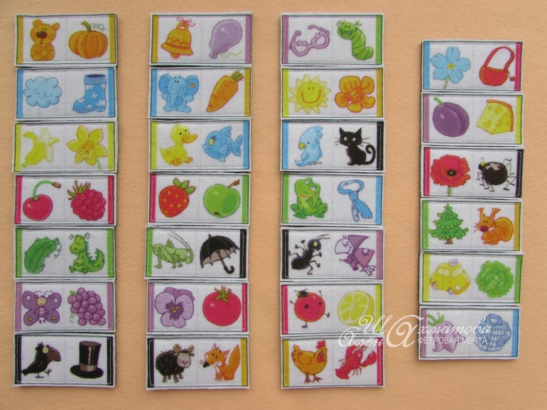 Сотворилось у меня вот такое домино)) 27 карточек размером 3,5 х 6,5 см с изображениями различных предметов и животных. Карточки плотные, состоят из 3х слоев жесткого фетра. Яркие картинки, цвет дублируется полоской сбоку.