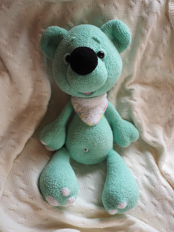 А у вас был ваш любимый мишка? Плюшевый! Нежный! С добрым и нежным взглядом! У меня в детстве был... и он был нежно мятного цвета. Будучи ребенком я его изрядно поюзала! Мишка пришел в негодность! Но я помнила о нем всегда! И вот! Уже будучи взрослой появился мой мяиный мишка вновь! Родился он с помощью нежных ниточек, крючка и заботливых ручек! Вот он -мой Мишута!