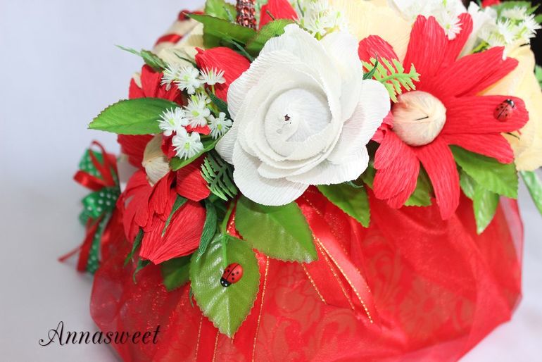 Был единственный заказ, да еще и на мое день рождения, хотела отказать,но просила хорошая знакомая. На удивление сделала очень быстро, а я жуткая капуша)) Были проблемы с конфетами, купила, а их оказалось мало, сутки искала, в итоге послала мужа ночью искать и он слава Богу нашел, фух....