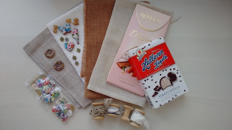 Тут и тканюшки, и множество пуговок красивенных, и кружево, и катушки, и подвески. И супер вкусняшки!))