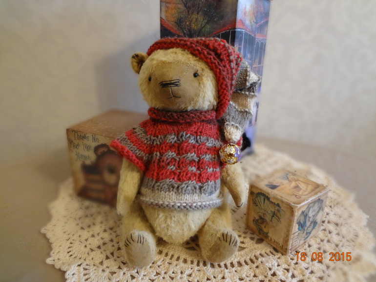Игрушечный мир - животныеМишка получился таким тепленьким и добрым мальчиком.Сшит из немецкой вискозы,набит плотненько опилочками.Рост 19см. Мишка довольно увесистый,благодаря металлическому грануляту,ручки и ножки на шплинтовом креплении,голова на двойном,покачивается.Тео состарен,тонирован масляными красками.Ножки у мишутки немного косолапые,самостоятельно не стоит,сидит уверенно.Мальчик утеплился к холодам и уже готовится к Новому году,поэтому у него такая интересная шапочка с бубенчиком. Мишка сшит по авторской выкройке полностью вручную с большой любовью и теплом)).