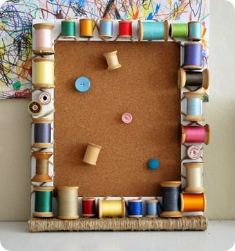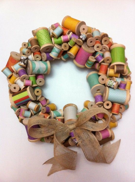 Честно говоря, я бы приклеила и больше катушек, но это все, что было. Тем не менее венок успел стать любимым, висит у меня на швейной машинке, радует рукодельное око)))