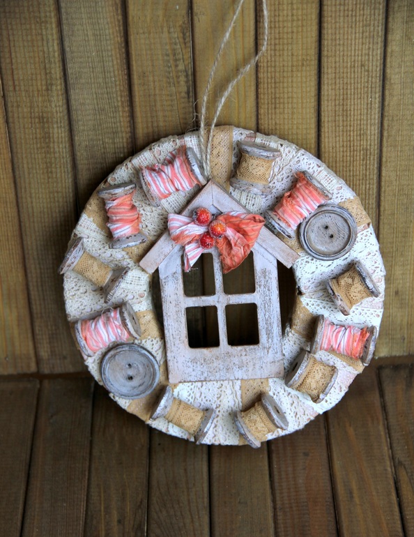 В основе веночка рамка из пенопласта, она легкая и прочная. Пришлось ее покрасить из белого цвета в экрю. Катушки и пуговки я заморила, пролачила, натерла парафином от свечи, и в конце концов покрыла слоем пепельно-розового акрила. Подсушив, потерла в лучших традициях шебби, сверху нанесла матовый лак. С домиком все то же самое. Кружева тонировала, ленты намотала на катушечки. Вооружилась тубой момент-кристалла, и вот венок готов.