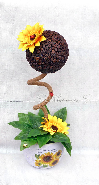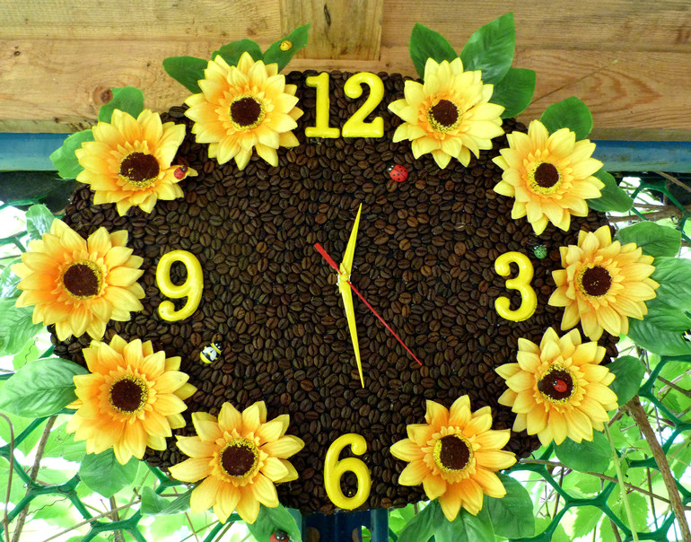Решили на даче оформить беседку в стиле "подсолнух". Была куплена посуда (графин, чашки, солонка, сахарница, салфетница) с подсолнушками, и в добавление к этому сотворили почти всей семьей топиарий и часики. Теперь у нас в беседке солнечно - подсолнечно!!!! Прям радуемся как дети.