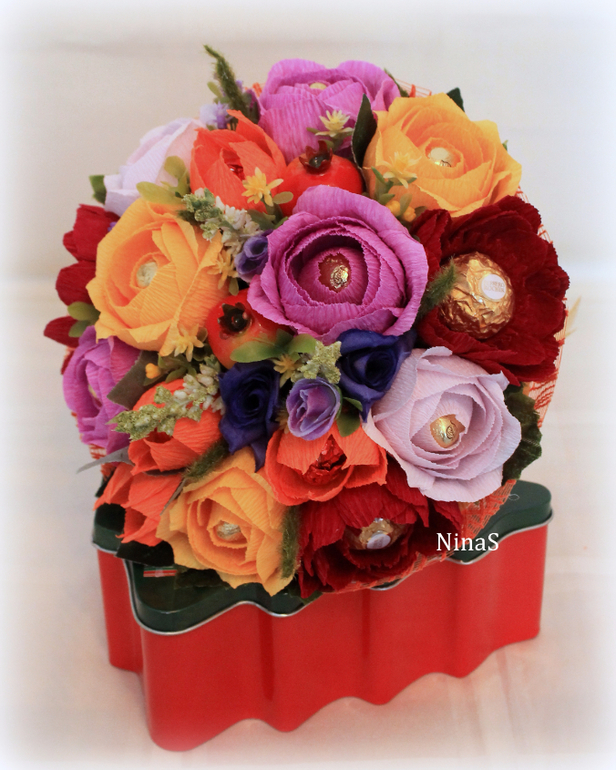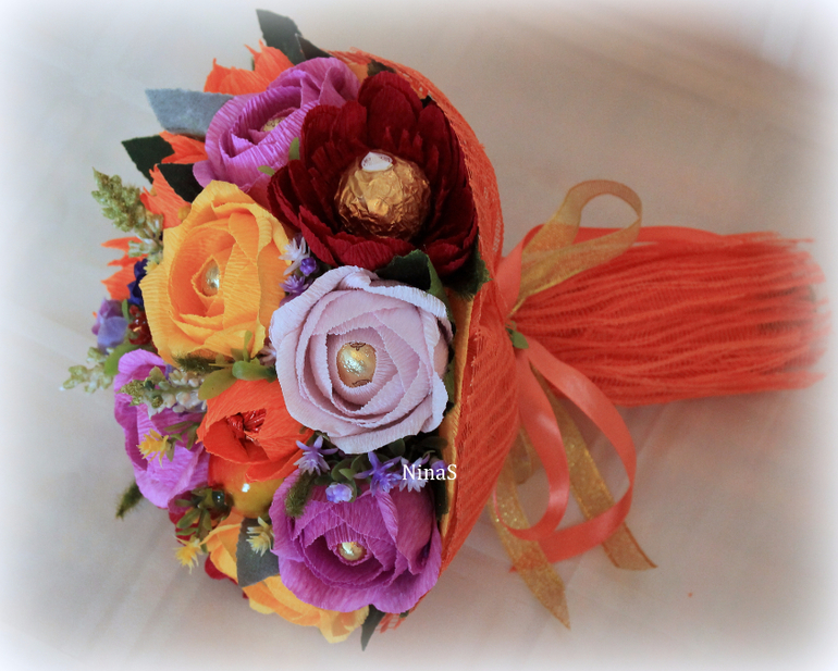 подбор цвета моей дочерью) брала у меня обрезки бумаги для игры, эти были скручены вместе, я взяла в основу для букета)