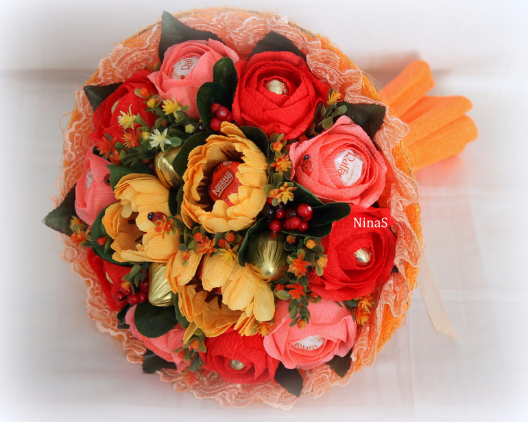 Букеты из конфет. Свитдизайн.Осенняя классика. Один букетик уехал в Москву к дорогим нашим и любимым друзьям. Второй делала для своей дочери. Так что мы идем в школу! Мандраж пытаюсь усмирить и излучать спокойствие))) Путь девочкам нашим учится будет легко)))