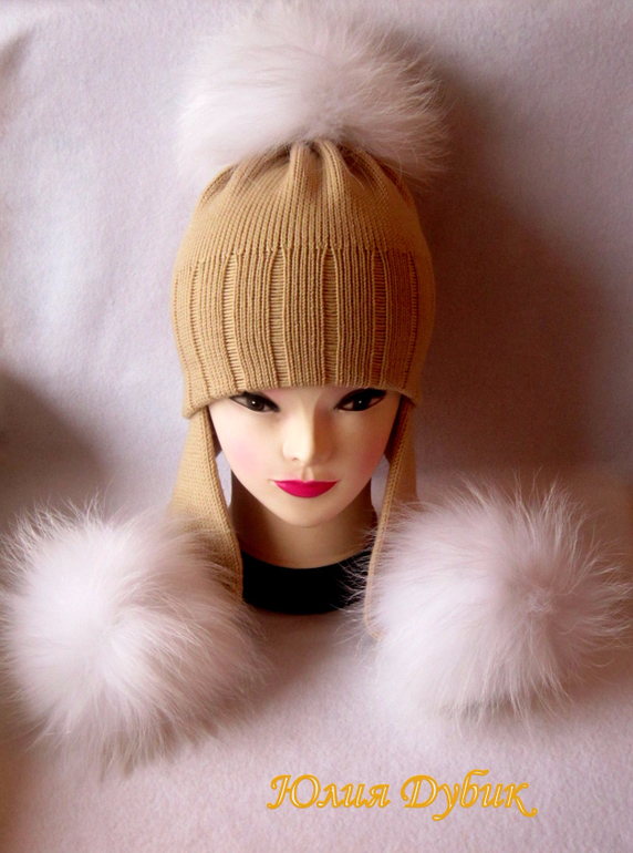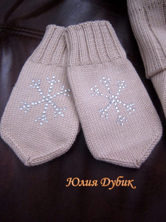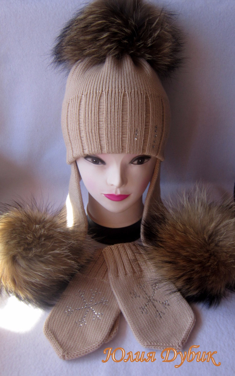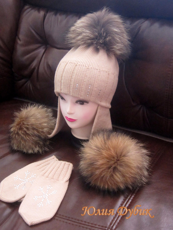 Шапочка хороша для девчуль постарше) когда уже не хотят ушки и завязки...а тут и шарфа не надо всё закрыто-прикрыто) шапочка в 2 слоя из мериносика конечно...украшена тремя большими енотовыми помпонами-смотрится стильно и богато) и варежки в комплект со снежинками из страз!