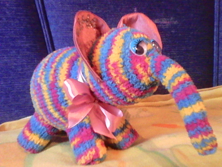 Увидела дочка в инете вязаного слона и попросила что бы я ей тоже сделала,вот ,смотрите,пару вечеров мое работы над слоненком.Пряжа плюшевая 50 грамм моток,ушел моточек полностью на слоненка.