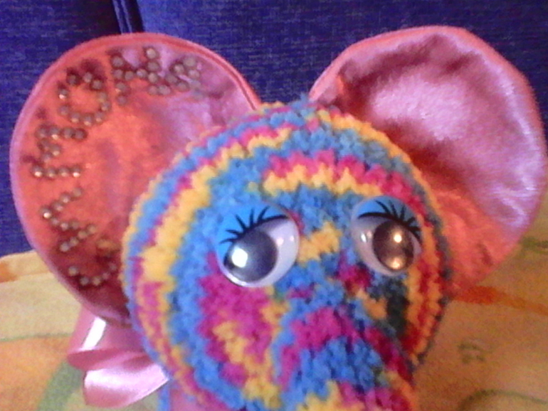 На ушке стразами выложила имя слоненка-Симона,дабы самой не забыть какое имя придумали.Дочка довольна,носила уже на танцы подружкам показать,мамочки тоже в восторге от нашего слоника.