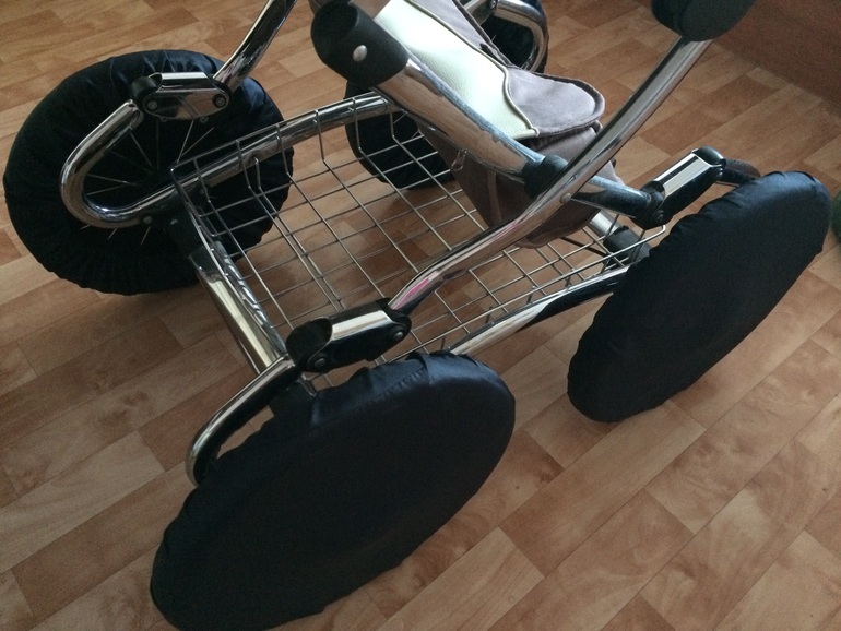 Так же я пошила чехлы на колеса коляски. Не найдя в магазине нужного диаметра (а колеса у нас очень большие-35 см вроде бы), я сшила такие чехлы. Казалось бы мелочь, а приятно)))Еще я пошила 2 простыни на резинке на детскую кроватку, но не сфоткала..