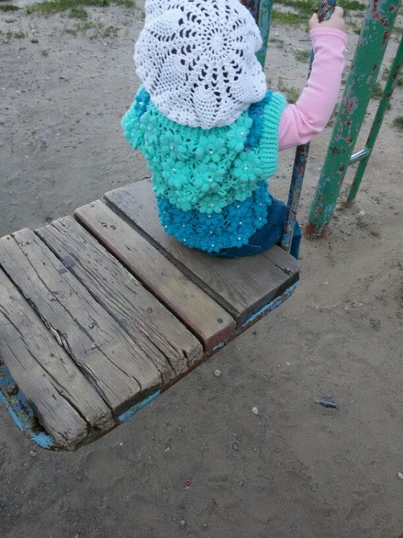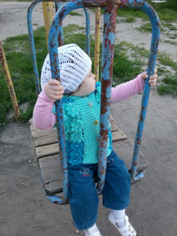 Это опять моя королева. В жилетке-пухлые цветочки и береточке,тоже мною связанной.