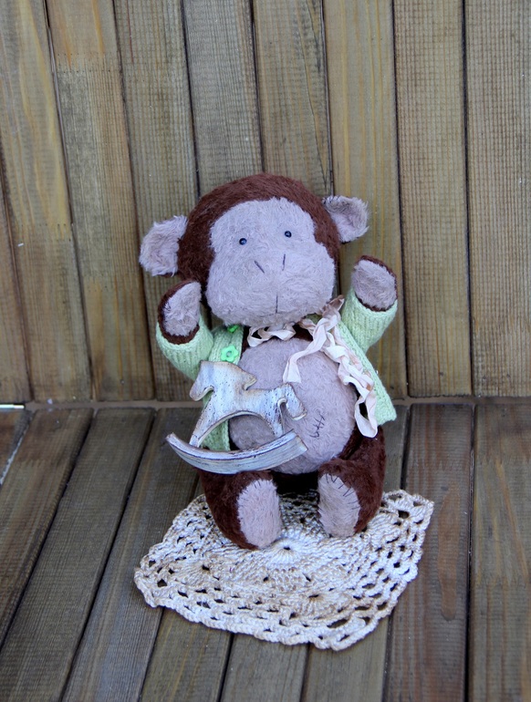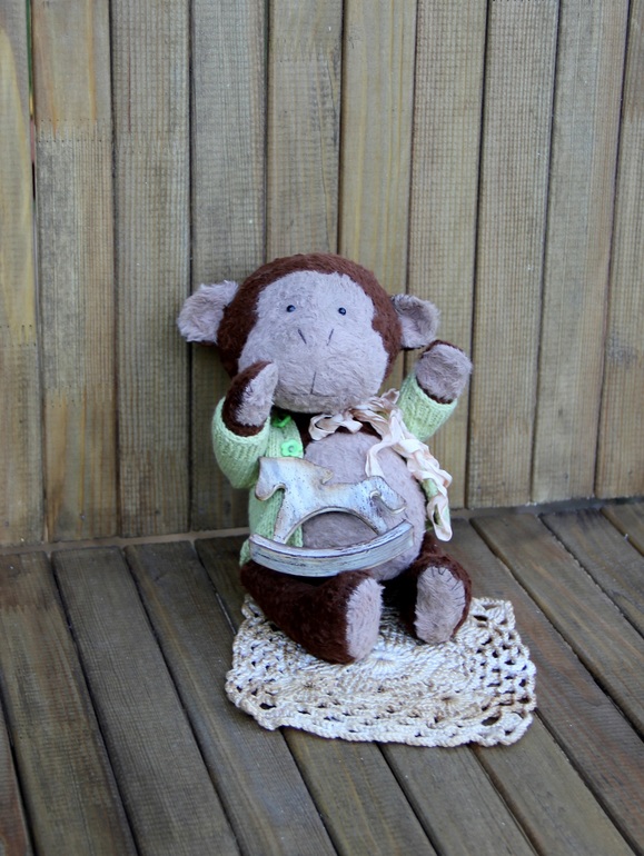 Игрушечный мир - животныеПридумалась и сшилась у меня вот такая обезьянка. Ростом она не мала - 22 см, сидя 17 см. Пузатенькая, круглая и увесистая, у нее отличный аппетит. Набита опилками, утяжелена гранулятом, с собой имеет старенькую лошадку-качалку.