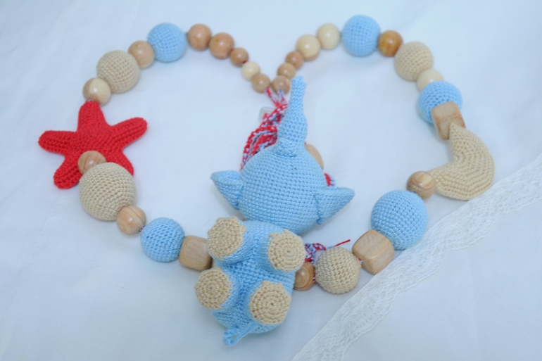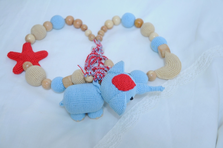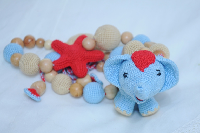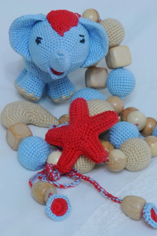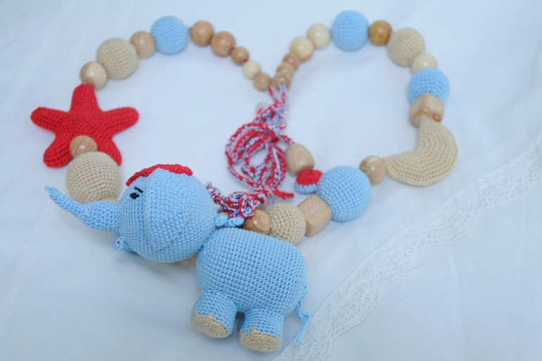 Абсолютно безопасные детские бусы. Слонёнок отвязывается - получается самостоятельная игрушка и бусы. Голова и туловище гремят, уши шуршат