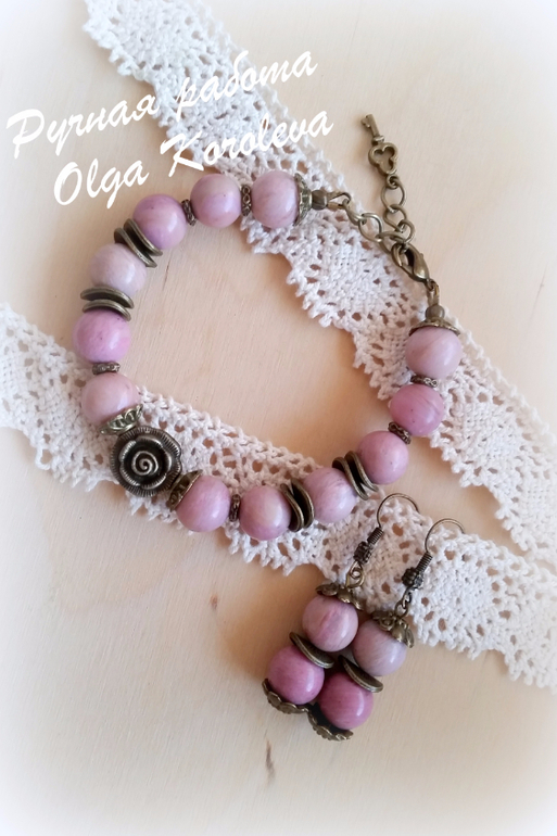 Бижутерия для слингомам. Слингобусы. Грызунки.Нежный комплект из родонита. Само название камня произошло от греческого «rhodon» - роза, что указывает на особую окраску родонита, характерную для розовых или красных роз. Еще его называют камнем утренней зари.