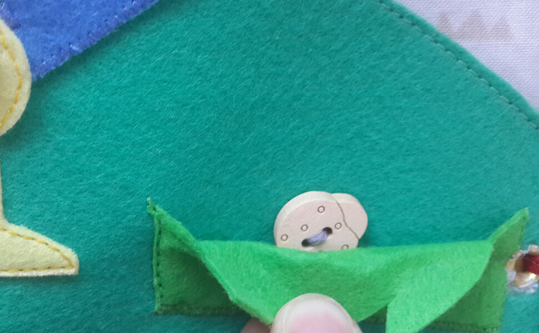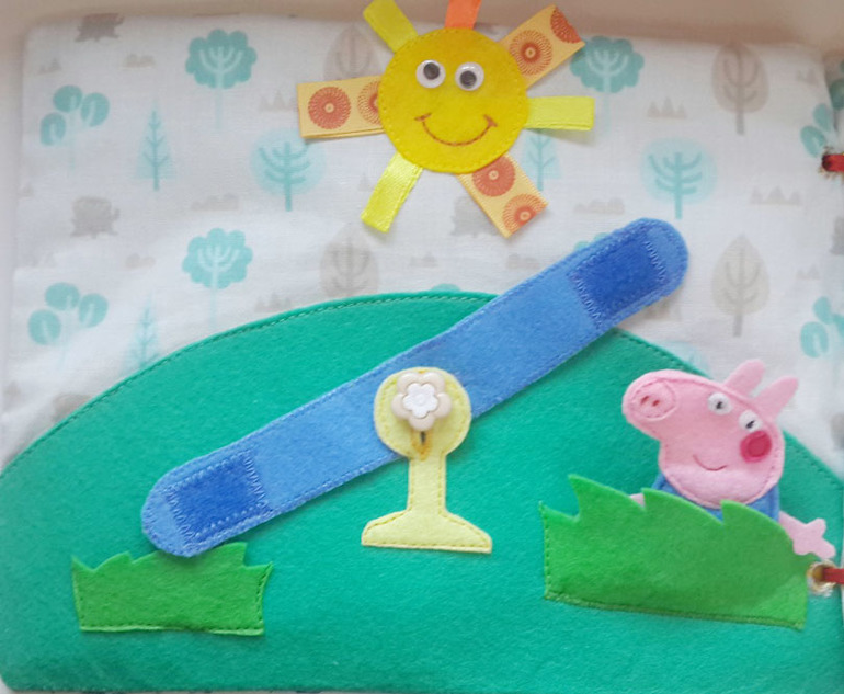 Герои на липучках, на качелях можно кататься, они легко двигаются благодаря петельке, в травке можно прятаться. У солнышка лучики отгибаются.