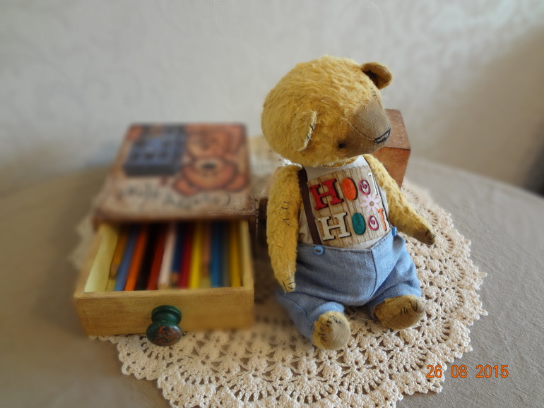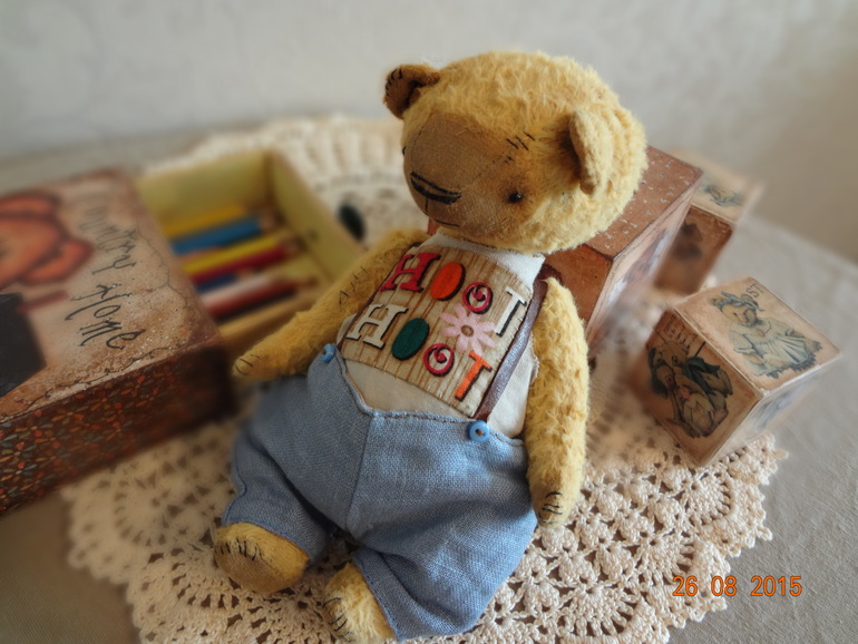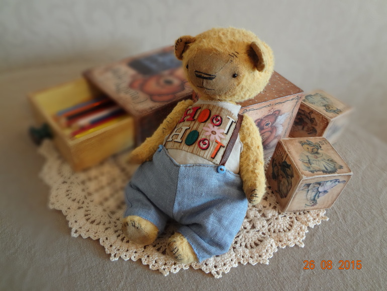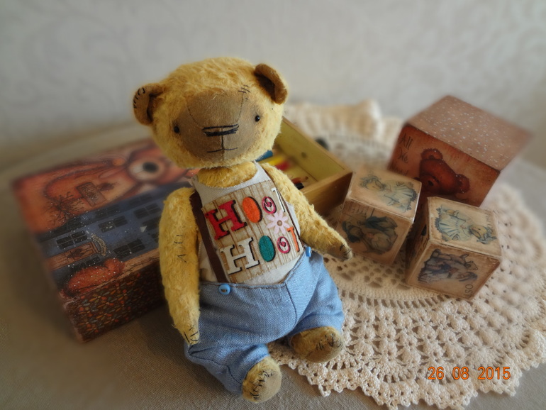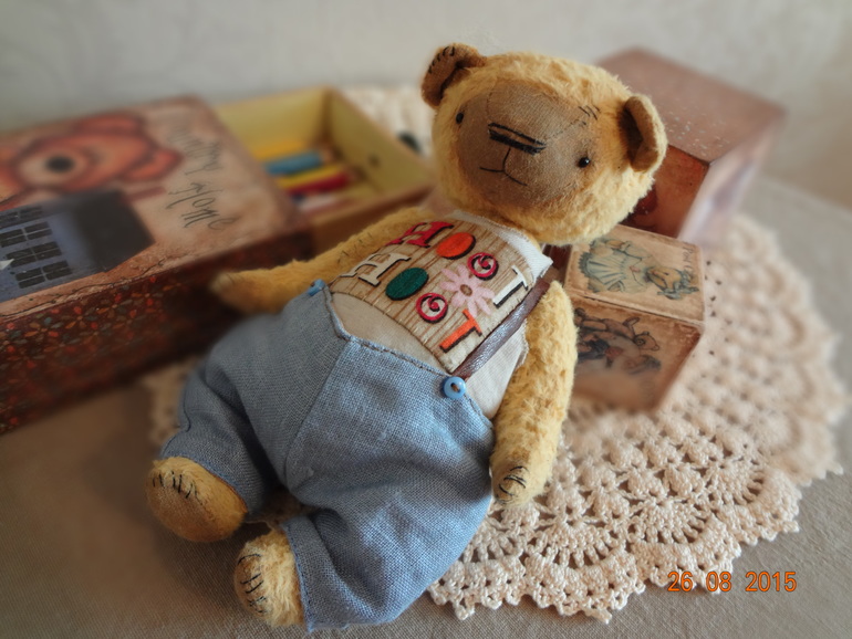 Игрушечный мир - животныеСегодня родился такой вот модный мальчик. Ростиклм 19см.Сшит из немецкой вискозы,набит плотненько опилочками,утяжелен стальным гранулятом.Шплинтовое крепление,голова на двойном,покачивается,ручки и ножки подвижны. Мишка состарен,тонирован художественными масляными красками,немного заштопан.Яник одет в штанишки из льна и модную маечку. Авторская выкройка,сшит полностью вручную)).