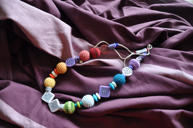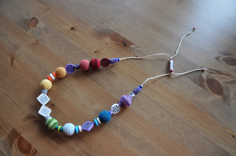 В общем самое сложное было собрать бусы. Не то что сложно технически, а просто пыталась как-то собрать чтобы в итоге красиво смотрелось из того что есть (так как заранее не планировала внешний вид). ну и хотелось чтобы со слингом моим купленным уже как-то сочеталось. В общем, вот что получилось. И не так уж и сложно, даже если держать крючок первый раз в жизни. Вязать понравилось. Надо будет запланировать что-нибудь еще связать =)