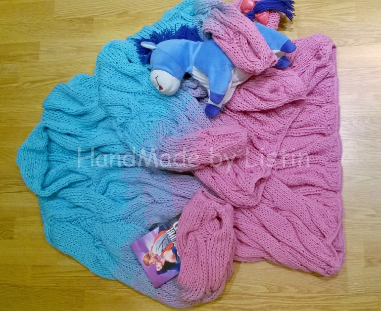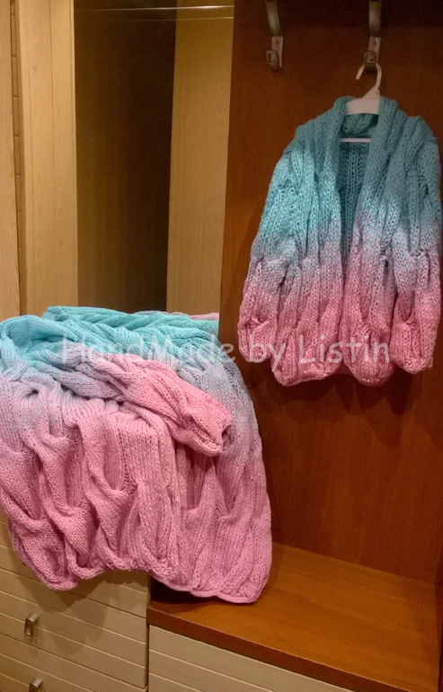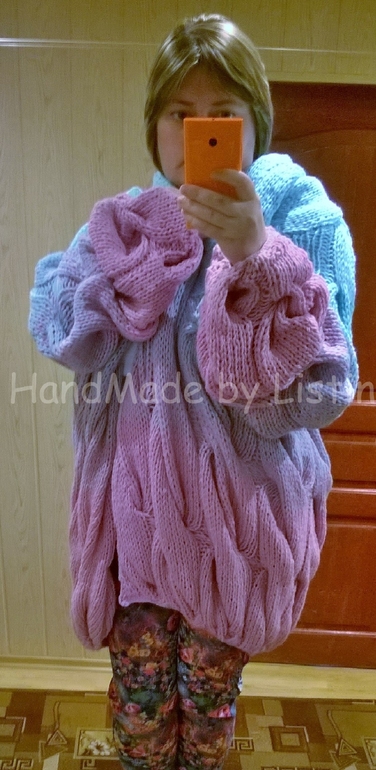 1. Для мамы р. 40-44. Связан из 12 кос. Коса 11*11 петель, в высоту 22 ряда. Длина по спинке 85 см, рукав от плеча 70 см.