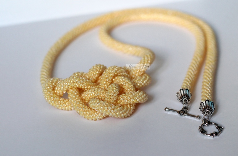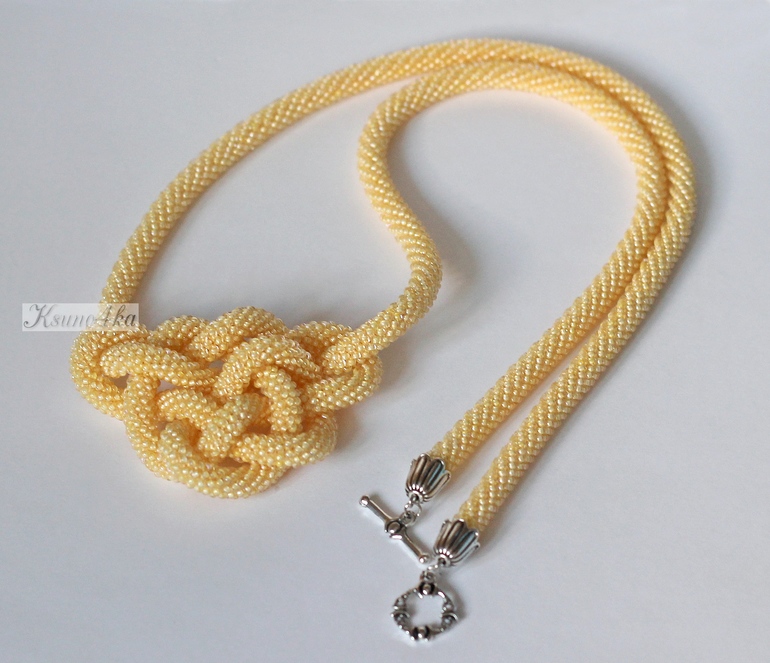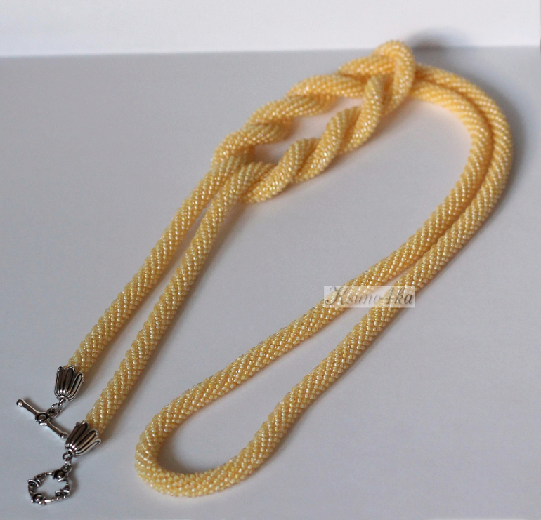 Ещё один трансформер - жгут "Лимонад". Его можно носить и в качестве жгута в два оборота, и в качестве лариата, и даже пояса. Многочисленные варианты завязывания узлов позволяют менять вид украшения и носить его с одеждой разных стилей.