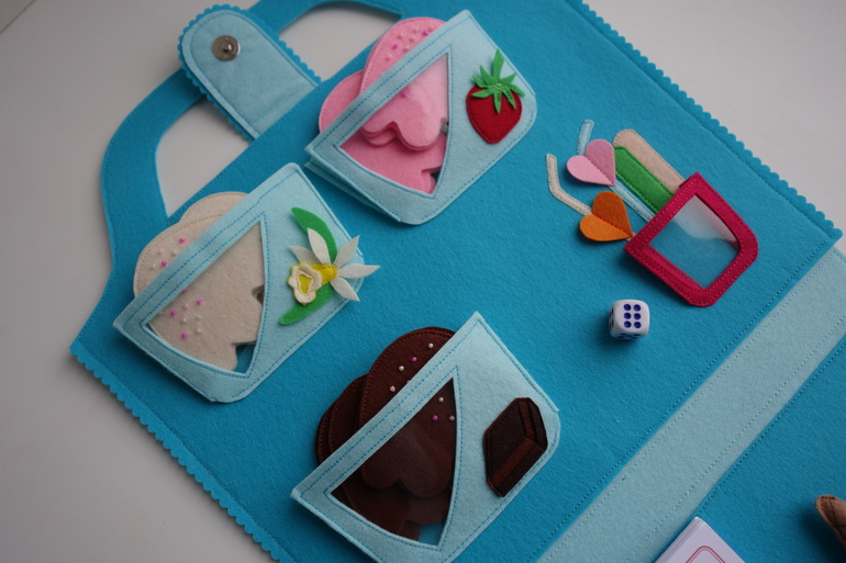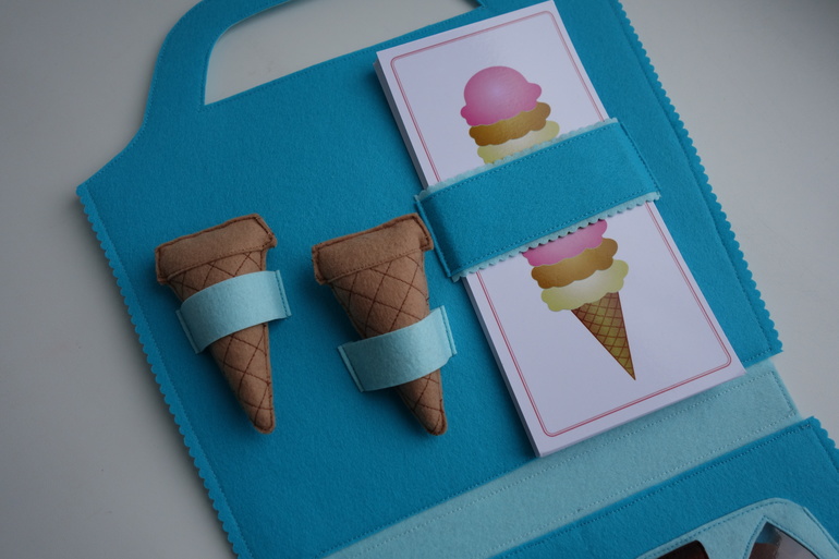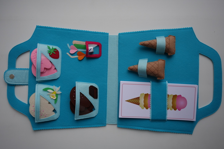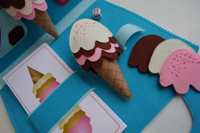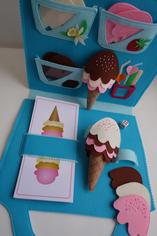 Сразу же скажу, что идея игры "Собери мороженку" не моя, её я увидела на просторах интернета, в основном на зарубежных ресурсах и в плоскостном бумажном варианте. Надо сказать, что иностранные детки очень любят собирать мороженки, но вот не видела ни одной игры, чтобы она была исполнена в объёме в фетре. Зато по просторам нашего интернета гуляет фетровый объёмный вариант мороженки уже давно, с лёгкой подачи Евгении Ершовой и пользуется тоже немалой популярностью. Так что я просто объединила, видимо, эти две идеи, собрала все игры по математике, применимые к простому вроде бы действию, сшила обложку и в итоге получила почти свою развивашку.