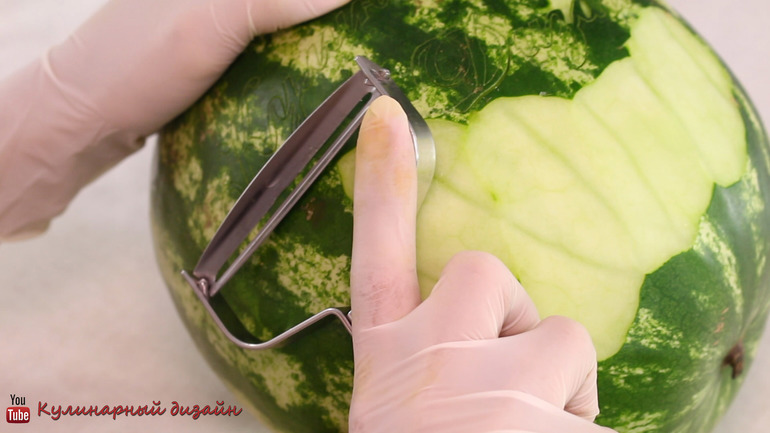 4. Очищаем пространство вокруг букв. Все мелкие детали вырезаем ножом, а крупные пласты можно снять овощечисткой. Аккуратно, не срежьте готовые буквы! Чистим приблизительно половину арбуза под будущие розы.