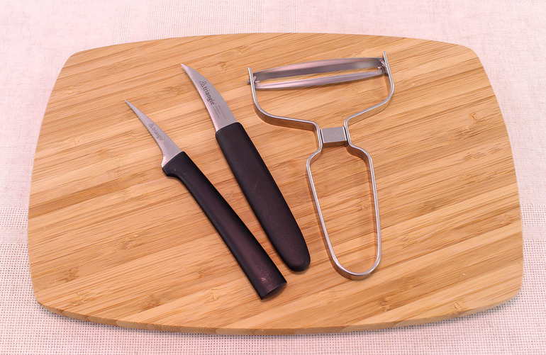 Мы будем использовать два разных ножа для карвинга с коротким лезвием, а также овощечистку. Надпись на арбуз будем наносить с помощью трафарета, предварительно напечатав надпись на клейкой бумаге.