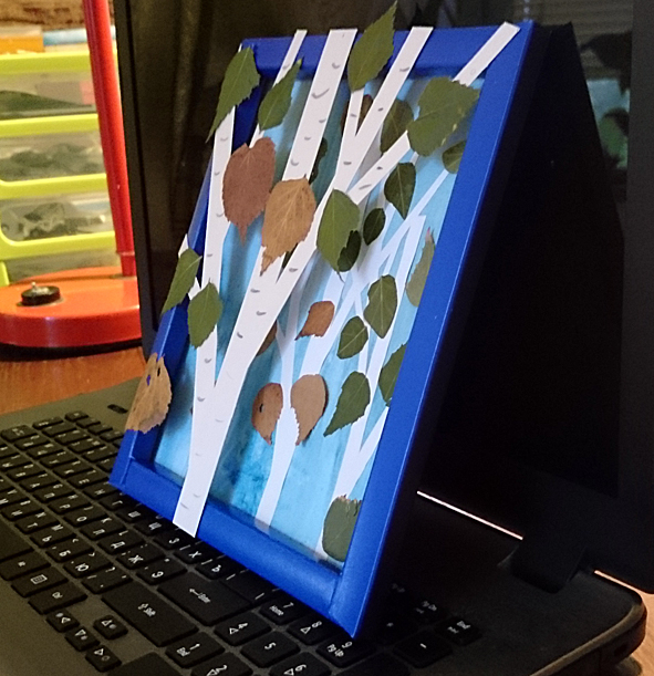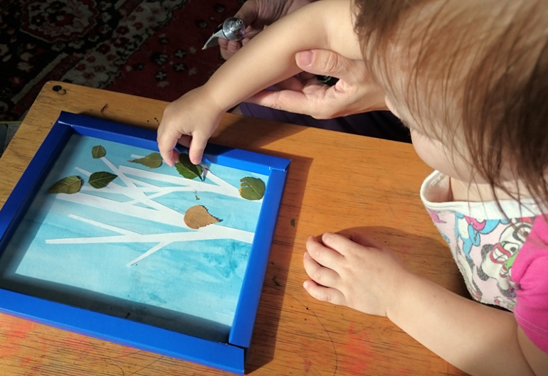 С младшей сделали "объемную картину". Оля только красила фон и приклеивала листочки. Аж в три этапа делали, пока усидчивости младшей не хватает