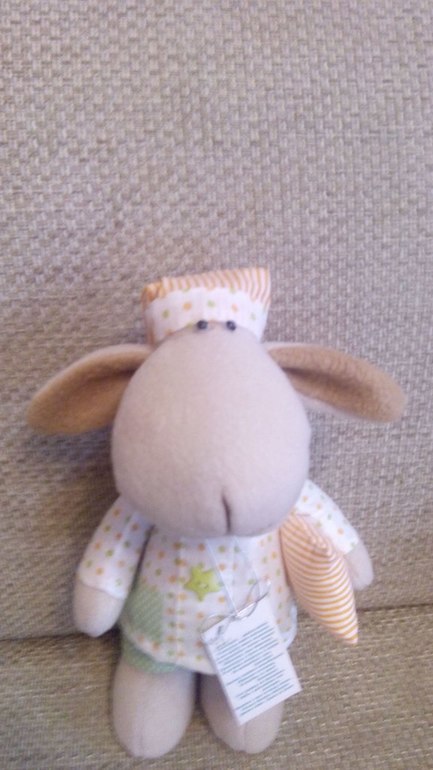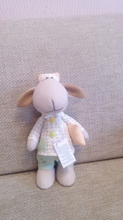 Фото конечно не очень, но я по другому не смогла))) Был вечер, дошила овечку и у меня её тут же увезли к рожденному хозяину. В лапках сшита подушечка, а на ней вышита буква К, первая буква имени малыша. Вообщем вот, что получилось! Овечка в пижаме с подушкой подмышкой))))) Овечка-Сплюшка одним словом! Прошу вашей оценки! Спасибо всем любопытным!