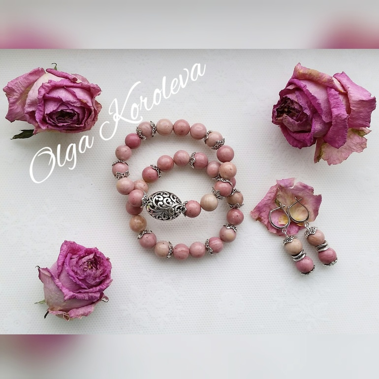 Нежный сет из двух браслетов на резинке и посеребренных серег с родонитом.