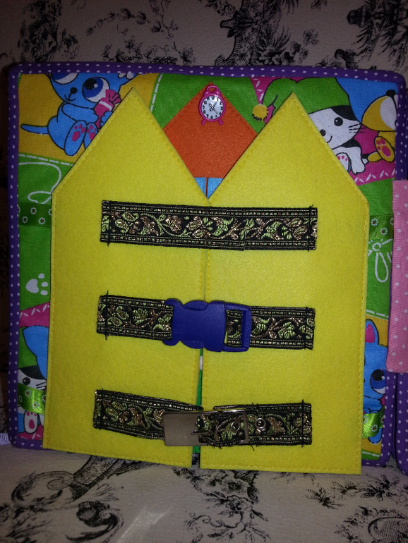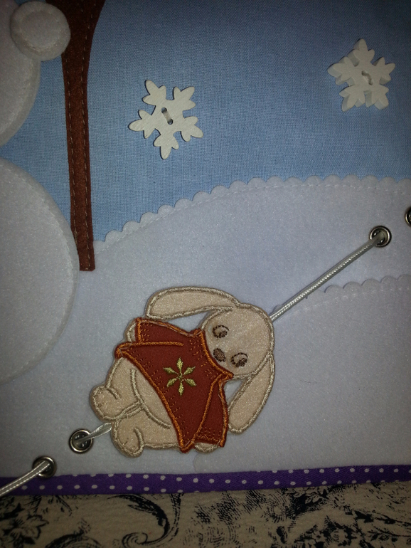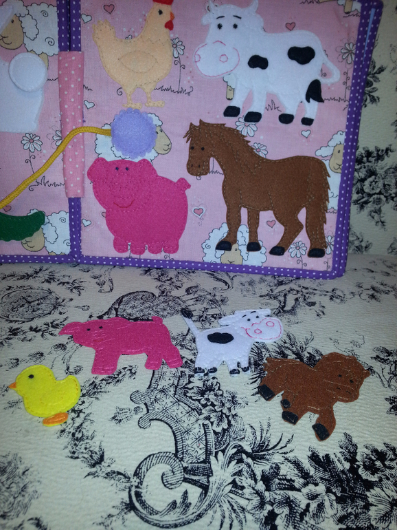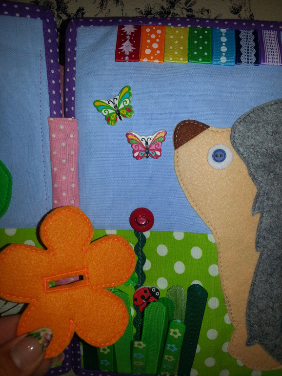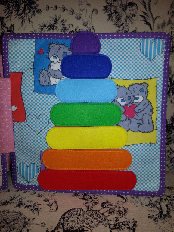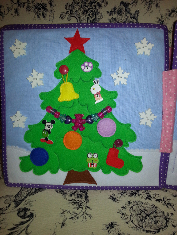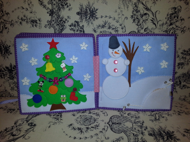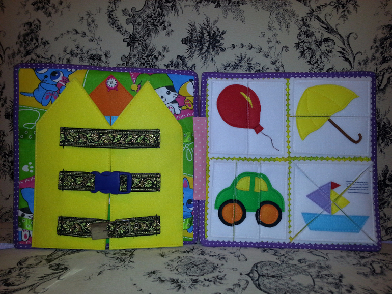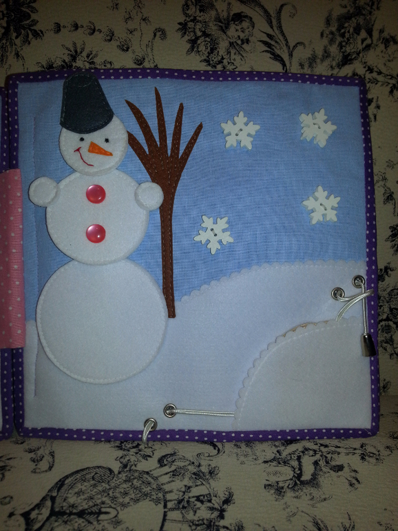 Книжка состоит из 8 листов ( 16 страниц - 2 обложки и 14 игровых страниц ), размер 23*23 см, съемных деталей получилось 65 шт..