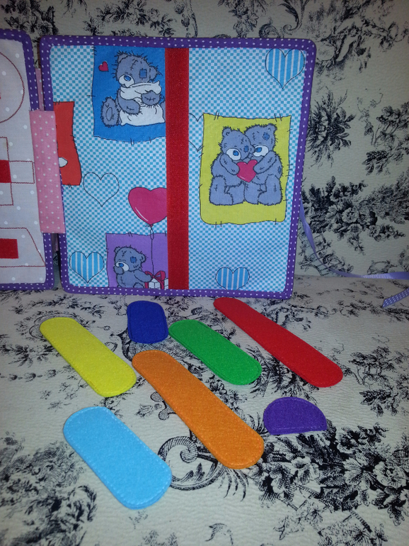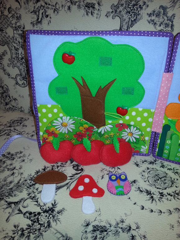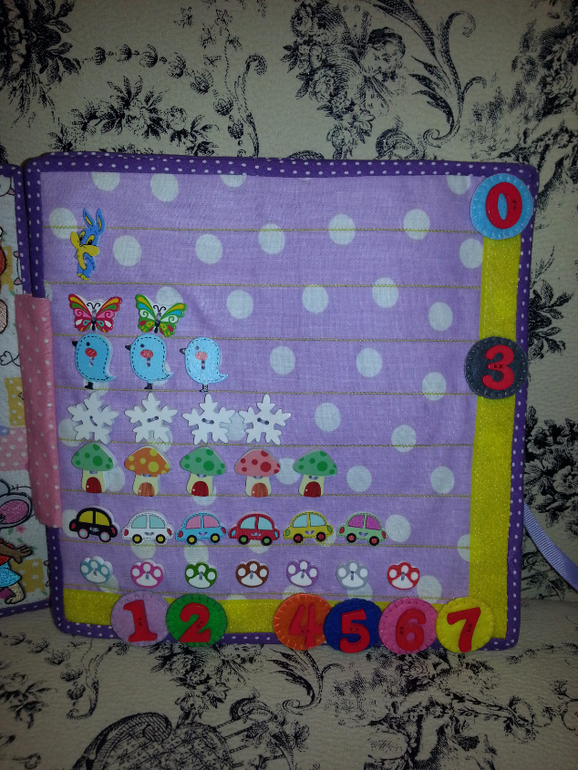 основа странички велькроткань, убрав пазлы, можно поиграть с другими детальками, например налепить яблочки и грибочки и подобрать к ним нужную по количеству цифру ...