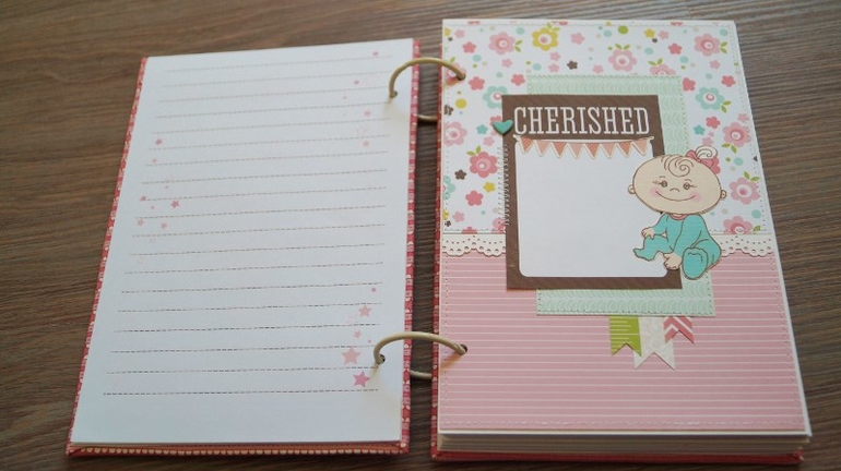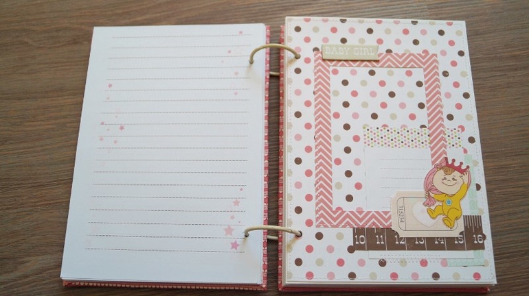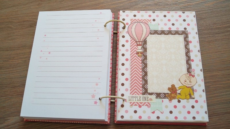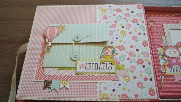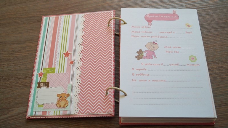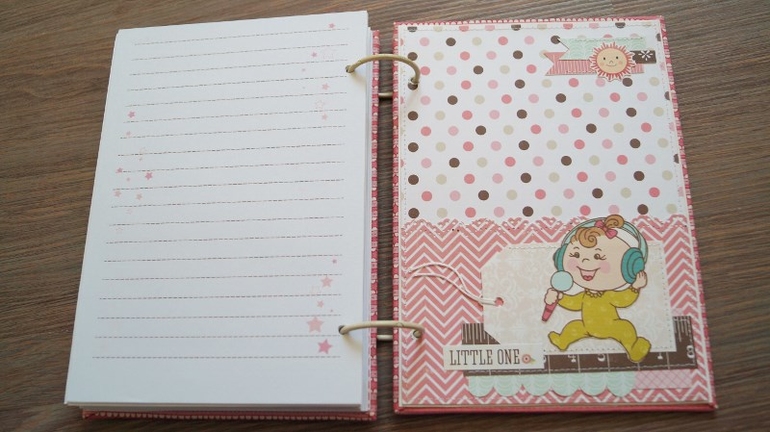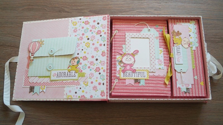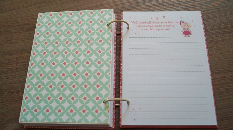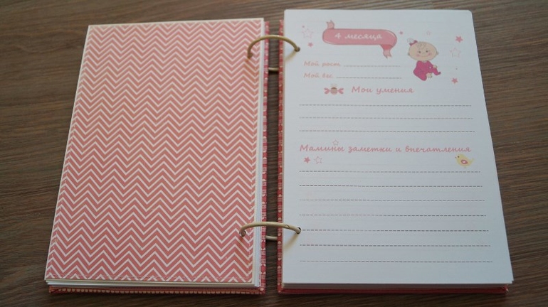 дальше блокното-альбом на первый год. В нем несколько разделителей, места для фотографий, кармашки для различных мелочей.