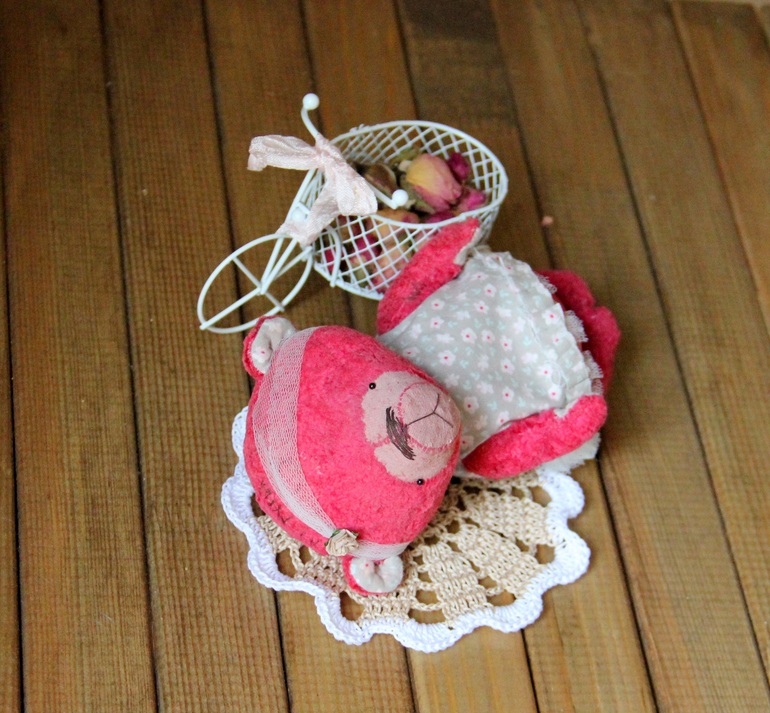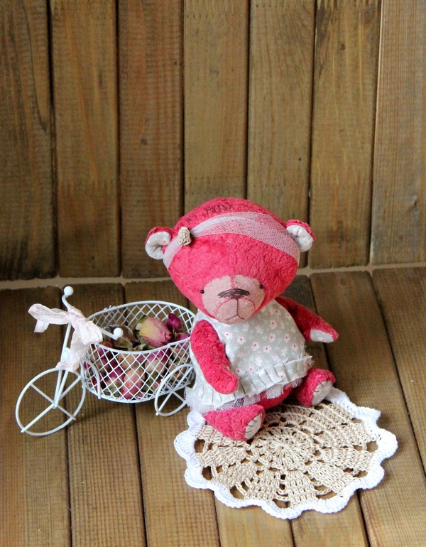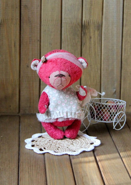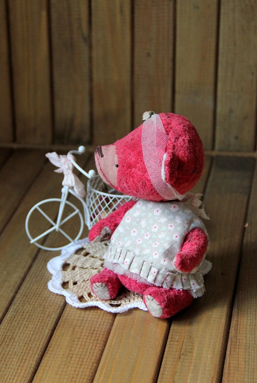 Джейн еще совсем мала, поместилась бы в чайной чашке, если бы ей пришла фантазия туда забраться. У Дженни есть белый велосипед, в корзинке которого сухоцветы миниатюрных розочек. Съемное платье из дымчато-серого хлопка с фатином, повязка с цветком - мишечка задумывалась в стиле ретро.