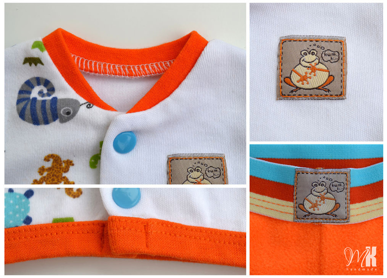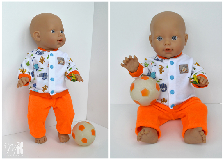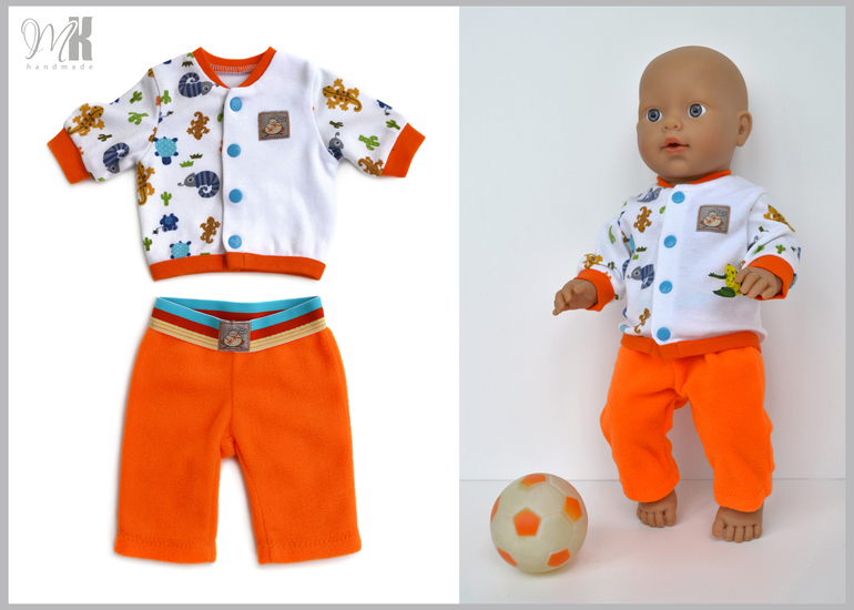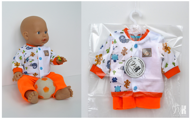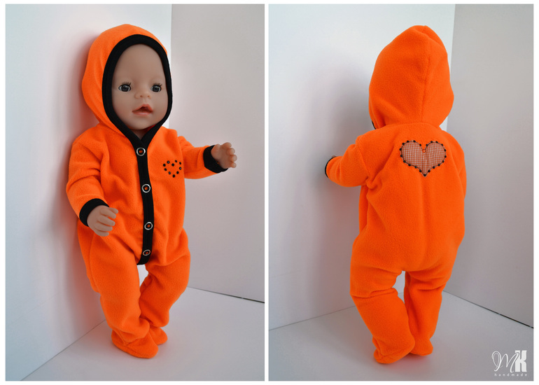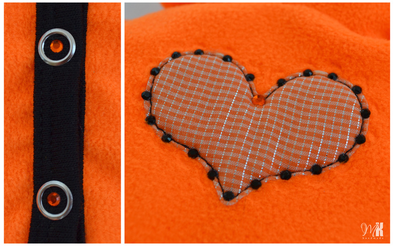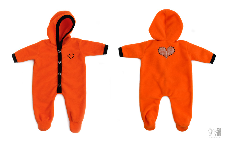 Комбинезон из яркого неоново-оранжевого флиса застегивается на кнопки, отделка - рибана с/л, декор - стразы.