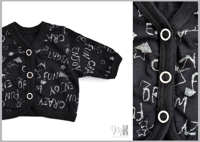 Кофточка из вискозной кулирки с серебристым принтом, застегивается на кнопочки.