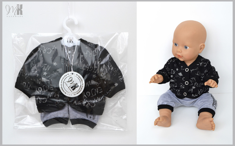Кофточка из трикотажа интерлок с забавным принтом, застегивается на бирюзовые кнопочки, украшена нашивкой.