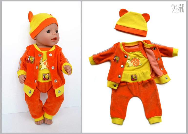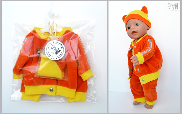Брюки и толстовка выполнены из мягкого, ярко оранжевого велюра, отделка - желтая рибана с/л.