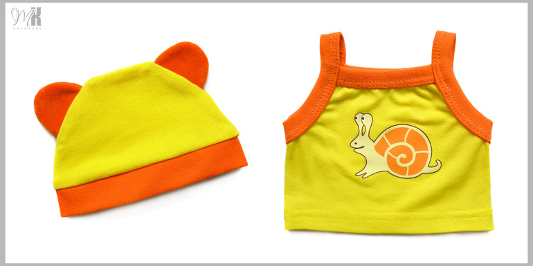 На майке из кулирки с/л - термотрансфер в виде забавной улитки. Завершает образ шапочка с велюровыми ушками.