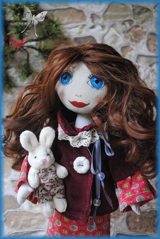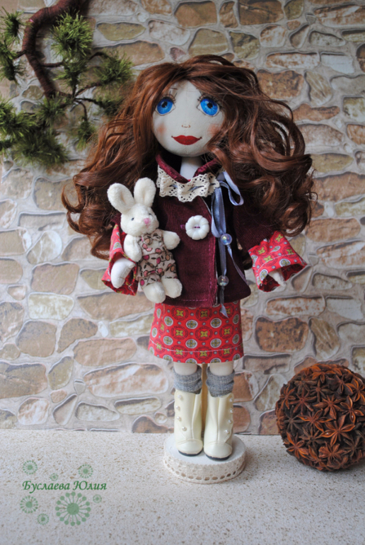 Вот и я снова в строю, долго отдыхала и набиралась сил и вдохновения. Покажу свою новую куколку Софи, одета она по осеннему в вельветовый пиджачок и сапожки. Волосы искусственные, как всегда густющие (люблю густые волосы) и кудрявые. В руках держит любимого зайку.