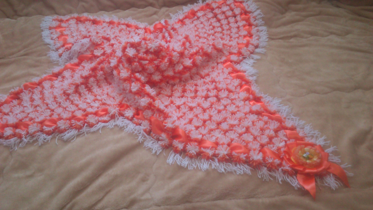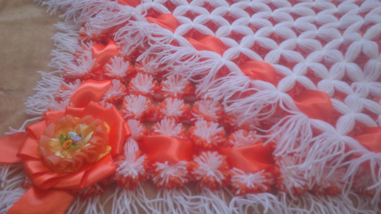 Мне тоже не нравятся атласные банты и цветы на вязаных пледиках, грубовато смотрятся. Лучше связать апликацию или цветок, будет нежнее. Но это МОЕ мнение. А плед - замечательный! Читала я мастер-класс, труд ОГРОМНЫЙ! Вы - молодец!
