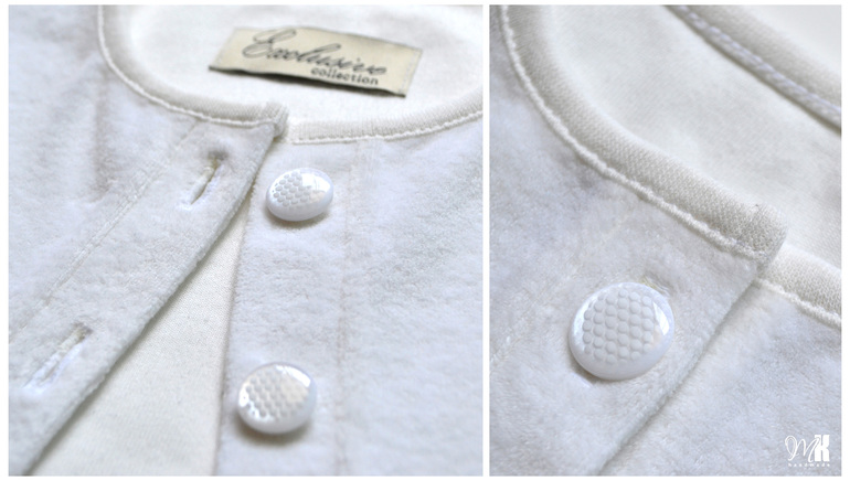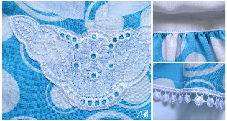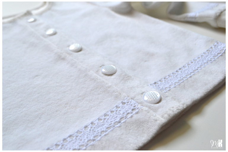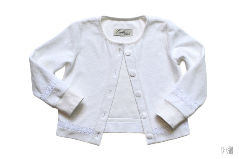 На полочках, спинке и рукавах нашито белое хлопковое кружево.