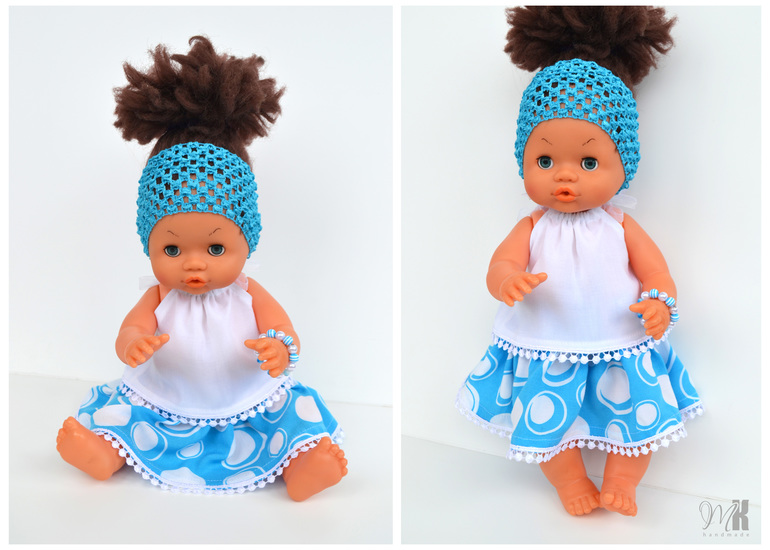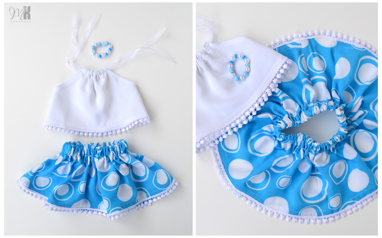 Да, из остатков (можно сказать - огрызков) хлопка и батиста, комплект для куколки: юбочка, топик и браслетик.