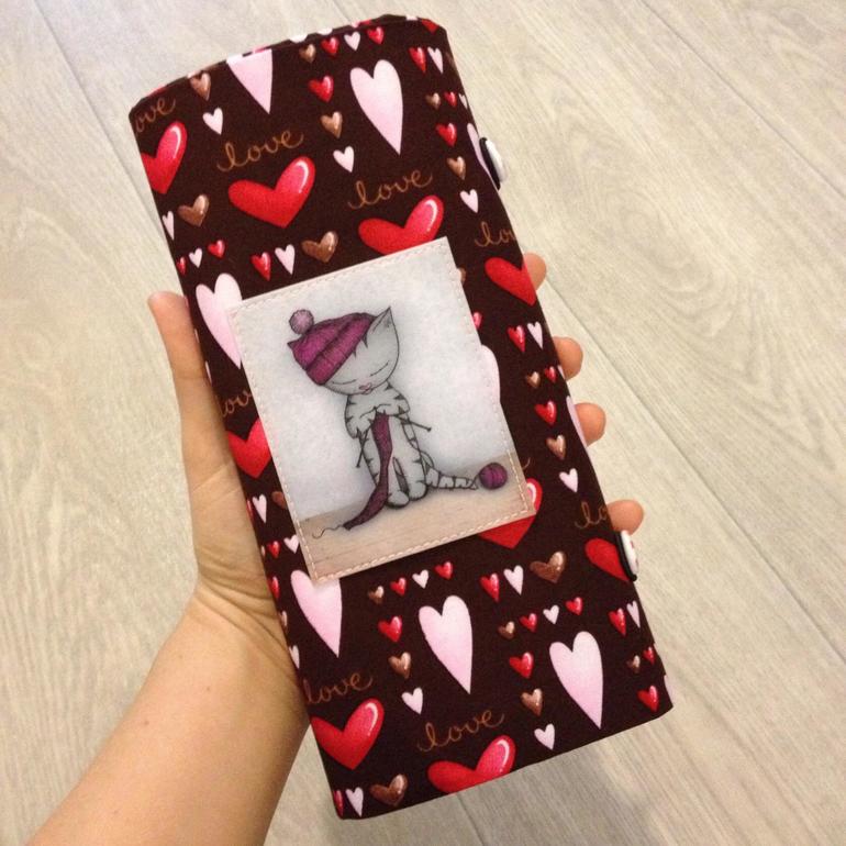 Размер в развернутом виде 25х50 см, закрывается в три сложения. Для больших спиц карманы не рассчитаны, мне думается ими не так часто пользуются, а вот маленькие зато всегда в одном месте, поэтому органайзер такой компактный получился. Ну и котик на обложке, по-моему это так мило, вяжущий котик
