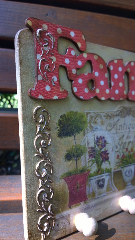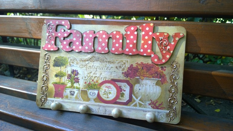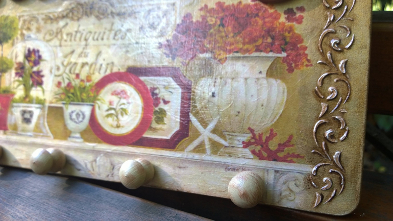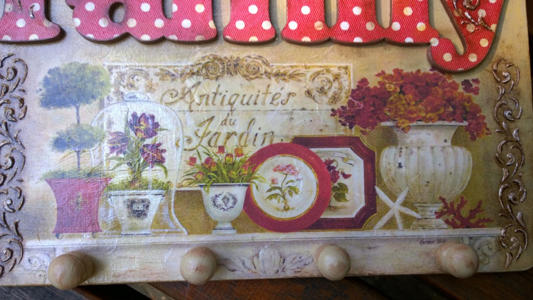 Ключница получилась не просто состаренной, а почти античной:) С выпуклыми рельефами в унисон использованной рисовой бумаге. Впервые наносила трафаретные вензеля, это не совсем мой стиль:) В общем меньше слов, больше фото ;)