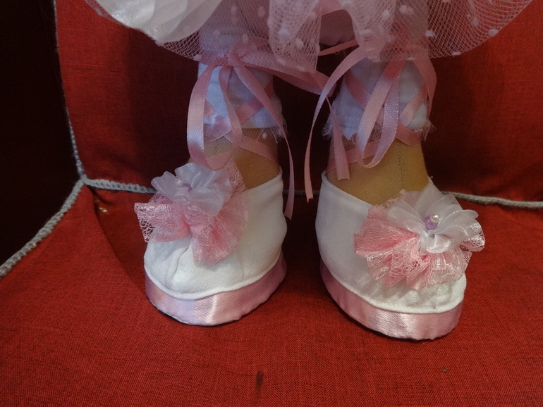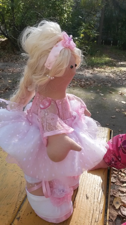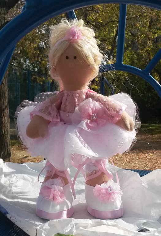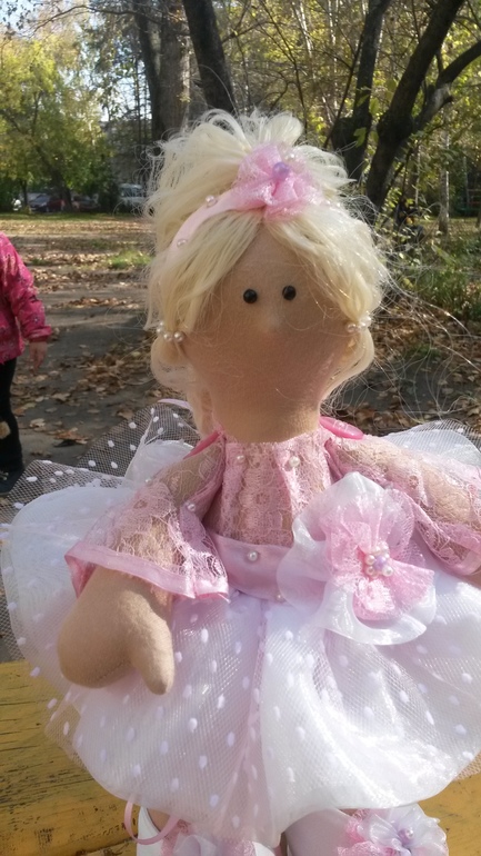 Сязана у меня с этой куклой не очень приятная история. Куклу шила впервые на заказ - просили балерину на подарок девочке. В итоге забирать мою барышню отказались, мотивируя тем, что "ожидали не такую и на балерину не похожа". В общем пополнит она мою домашнюю коллекцию. Кому не трудно - прокомментируйте, пожалуйста, может на самом деле не похожа и я что-то не понимаю.