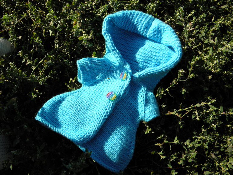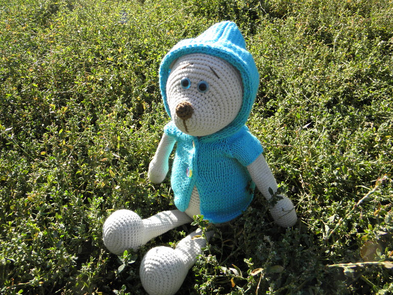 Одет в тёпленькую кофточку с капюшоном,которую можно по желанию снять.Кофточку украшают весёленькие пуговки-радужки))
